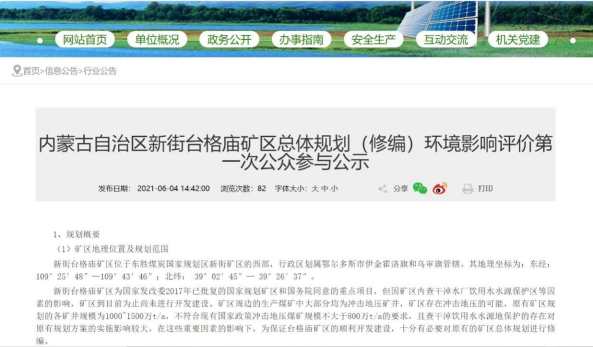 2021 年7月12日在鄂爾多斯市能源局政府網上進行了第二次信息公示,同時在公示中附上了查閱報告書征求意見稿及公參意見表的公示鏈接,征求公眾對報告書征求意見稿的相關意見,公示時間共計為10個工作日。向公眾公告以下信息: